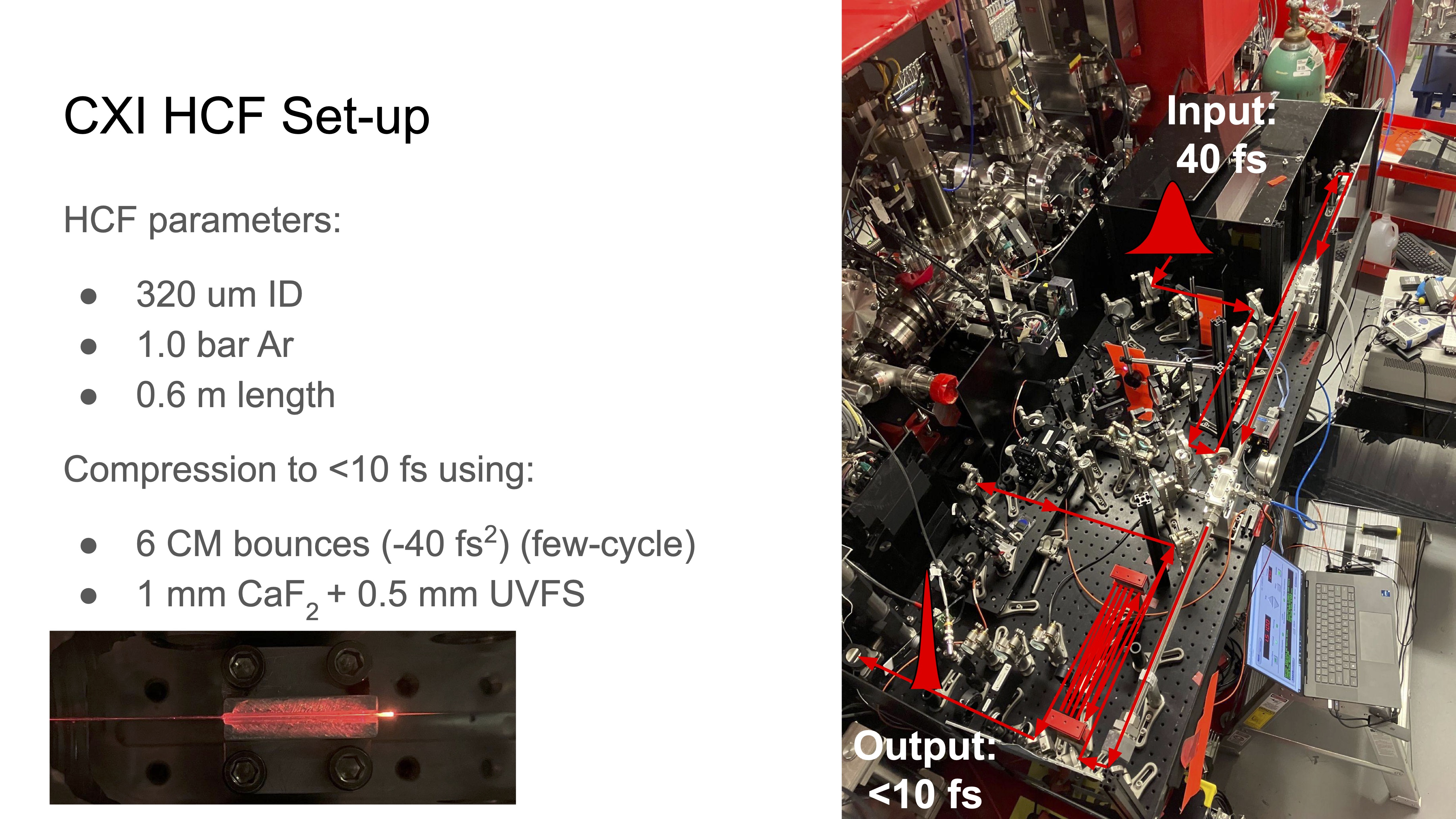 The hollow capillary fiber (HCF) set-up and laser beam path is depicted below.