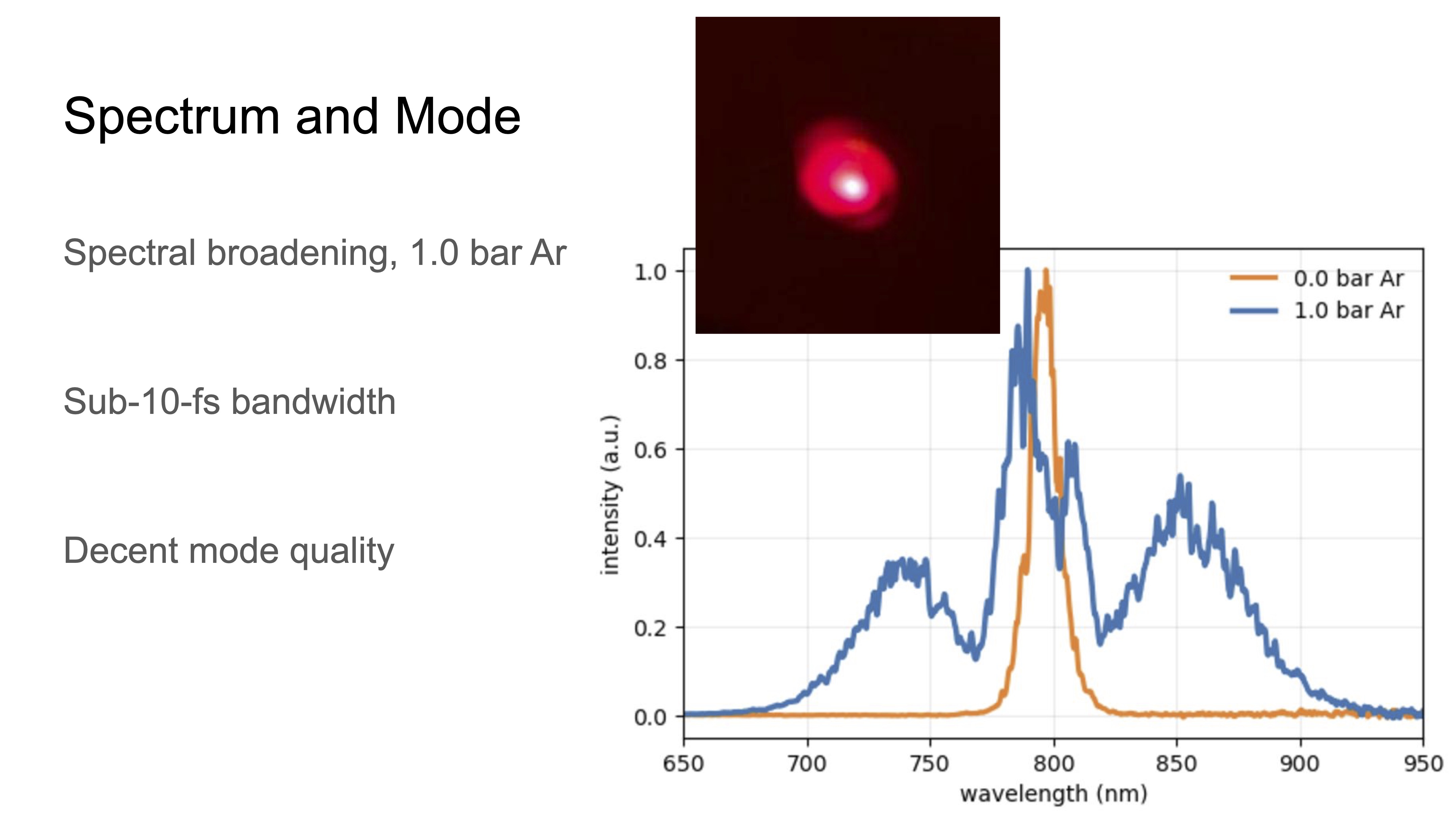The spectrum of the output of the HCF is shown below when under vacuum and pressurized with 1.0 bar of Ar, showing the spectral broadening. The mode is also shown and isn’t the worst thing ever.