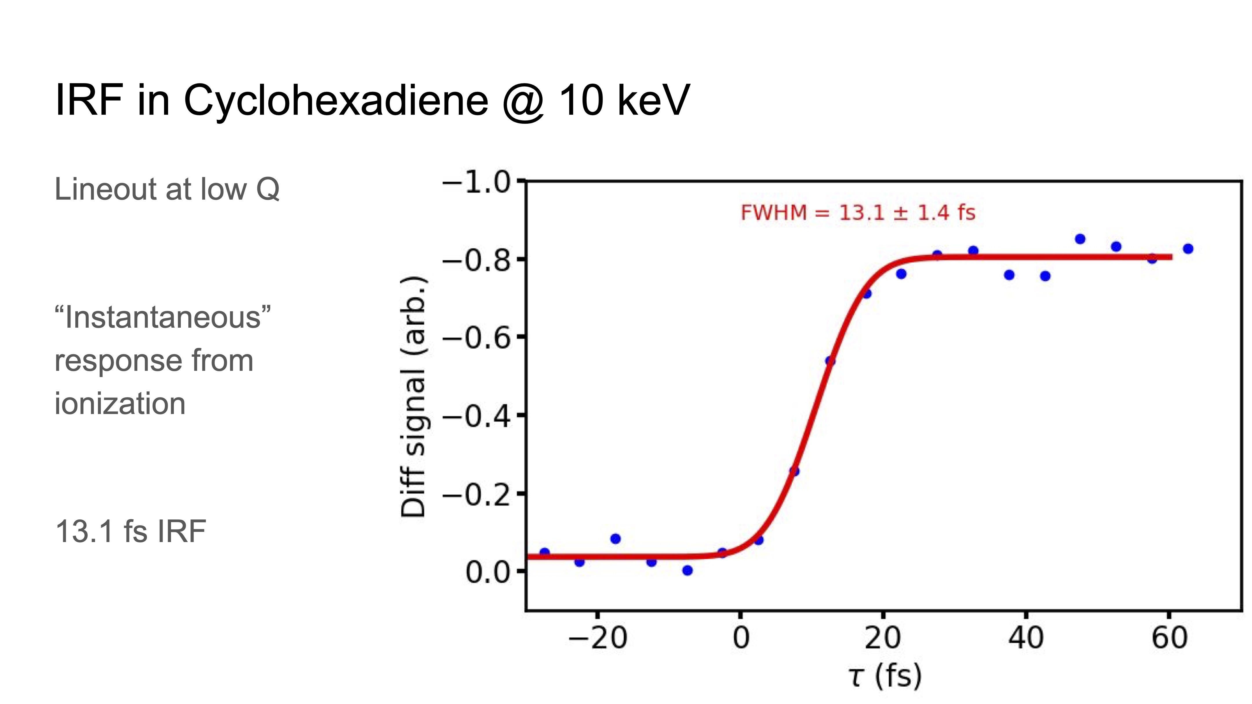 Using the FEL in half-charge mode at 9.8 keV and the 8.3 fs 800 nm pulses, we measured a 13.1 fs instrument response function in cyclohexadiene following strong-field ionization.