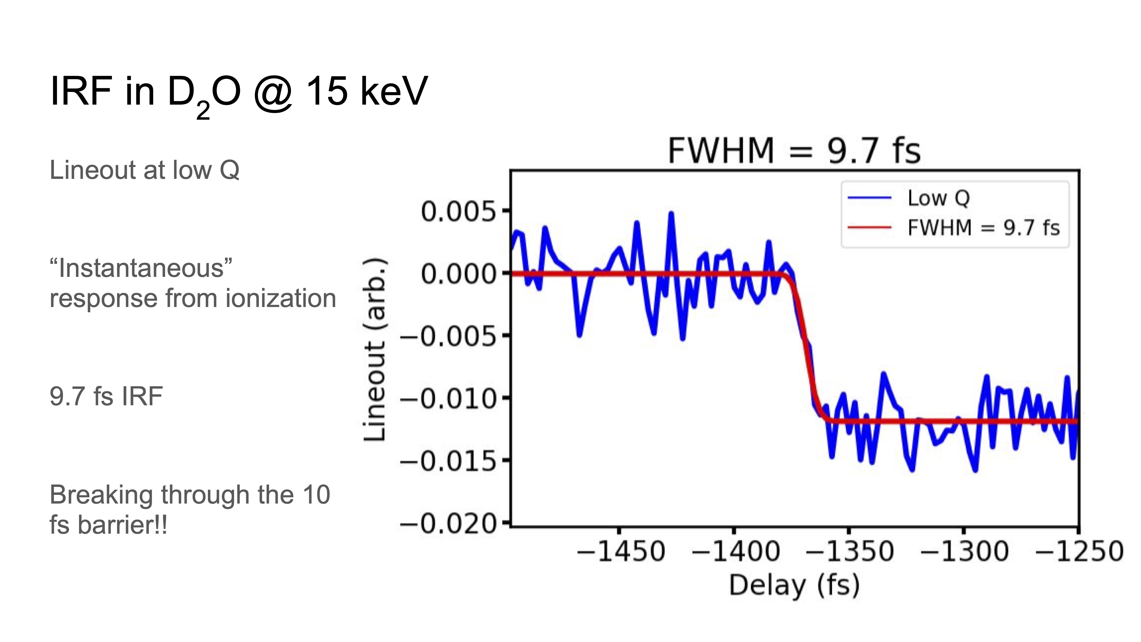 Using the FEL in half-charge mode at 15 keV and the 8.3 fs 800 nm pulses, we measured a 9.7 fs instrument response function in heavy water following strong-field ionization.