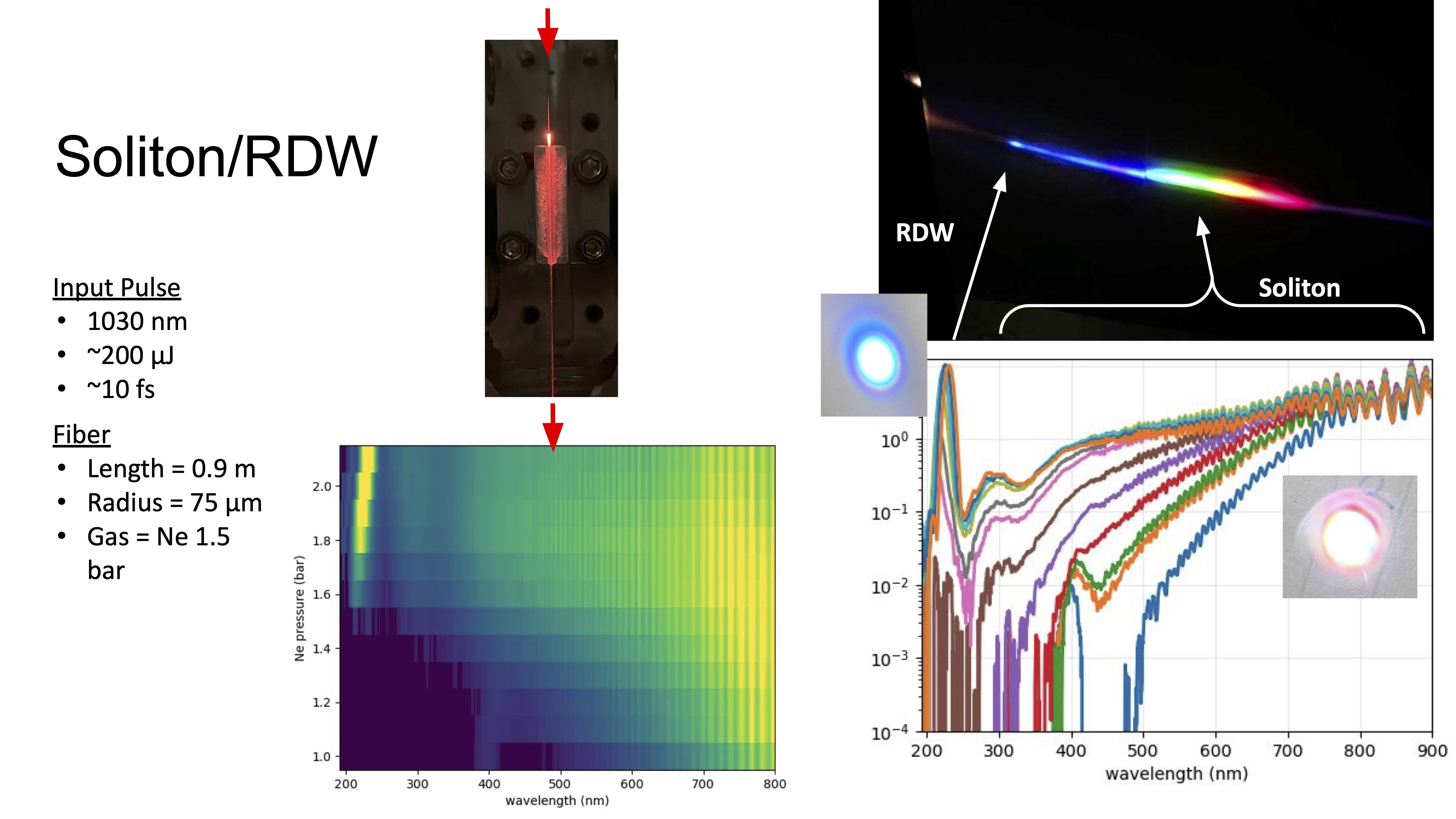 The parameters for the RDW/soliton generation fiber are presented below, in addition to some exemplary spectra.