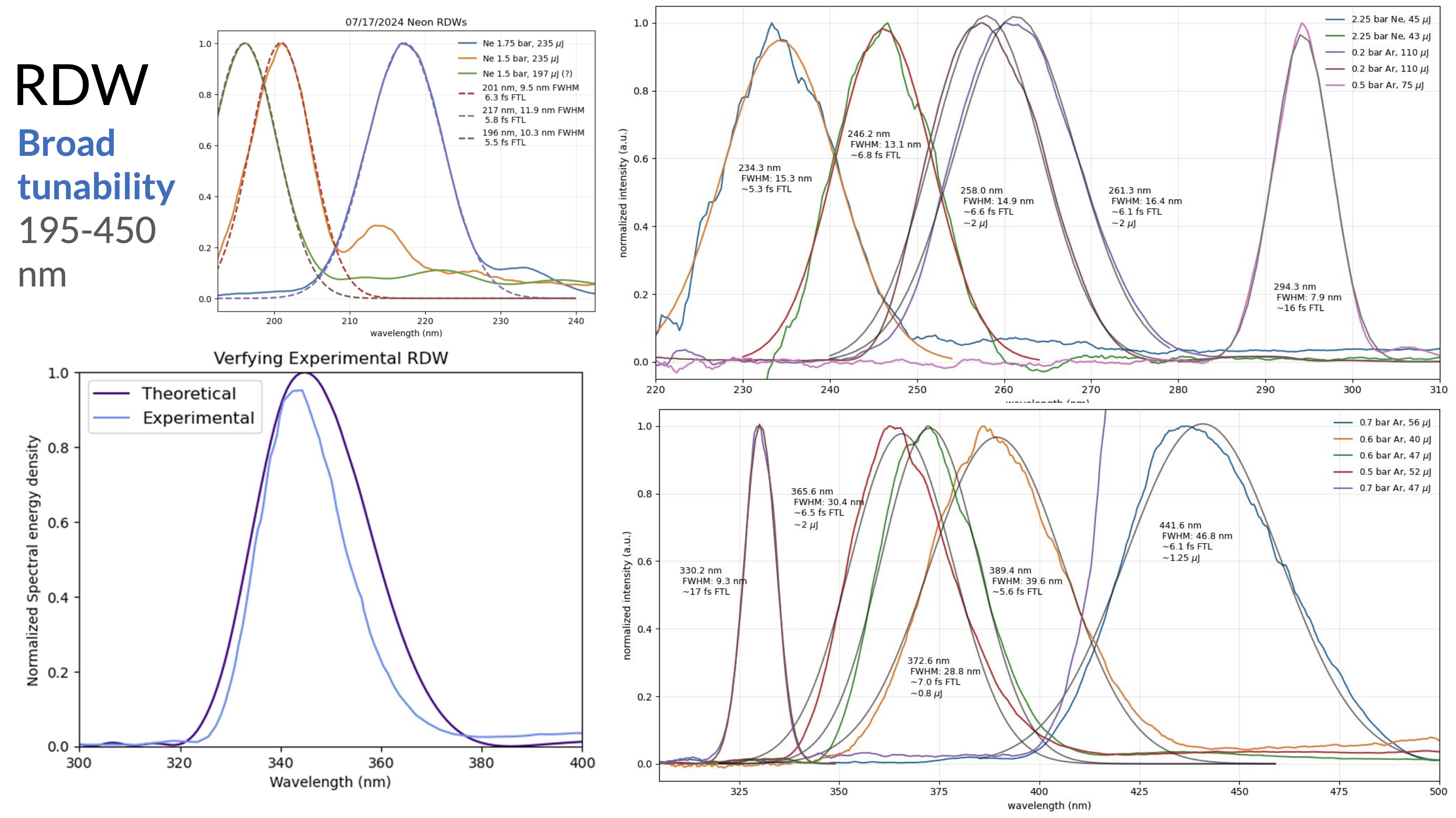 The tunability of the RDW is illustrated by simply changing gas pressure and gas species in the hollow capillary fiber, providing spectral coverage from 195 - 450 nm.