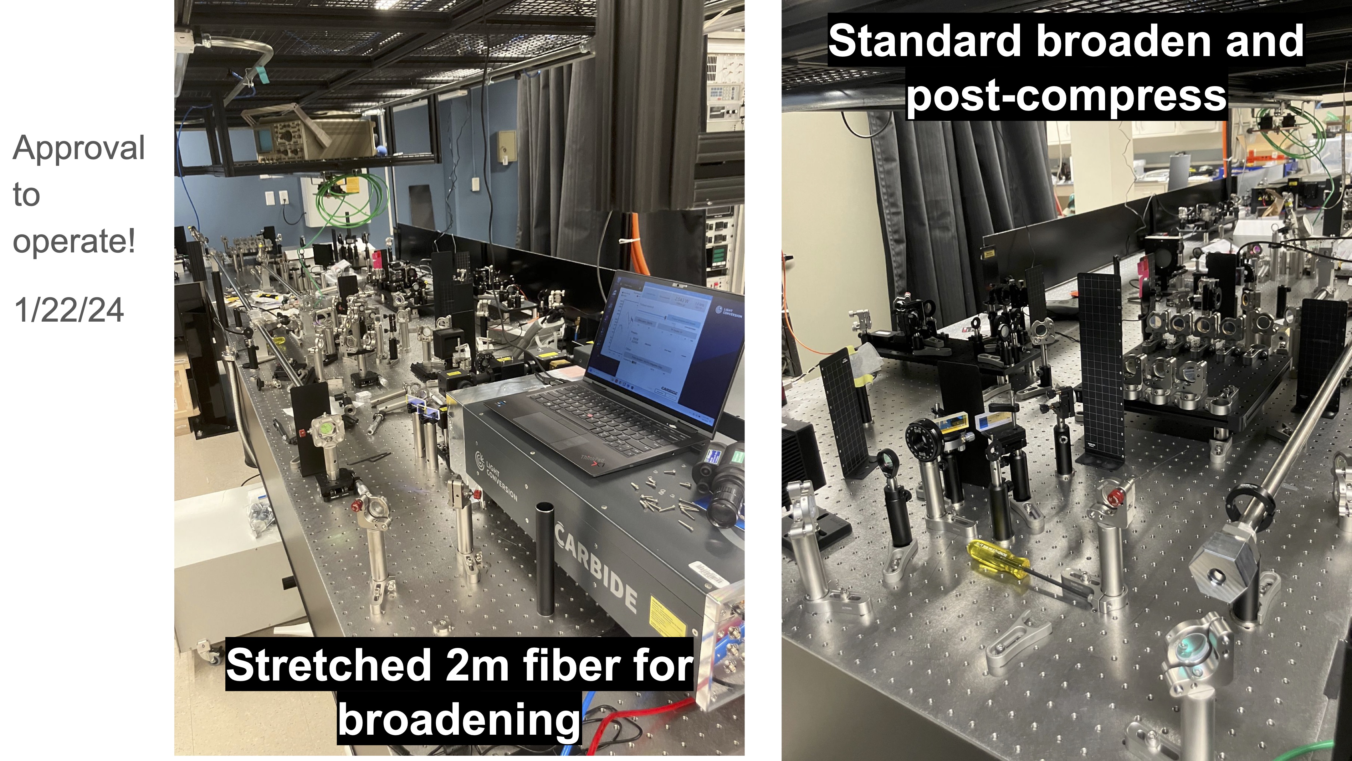 The laser set-up is depicted below, showing the stretched ~2m long hollow capillary fiber and the chirped mirrors used for post-compression.