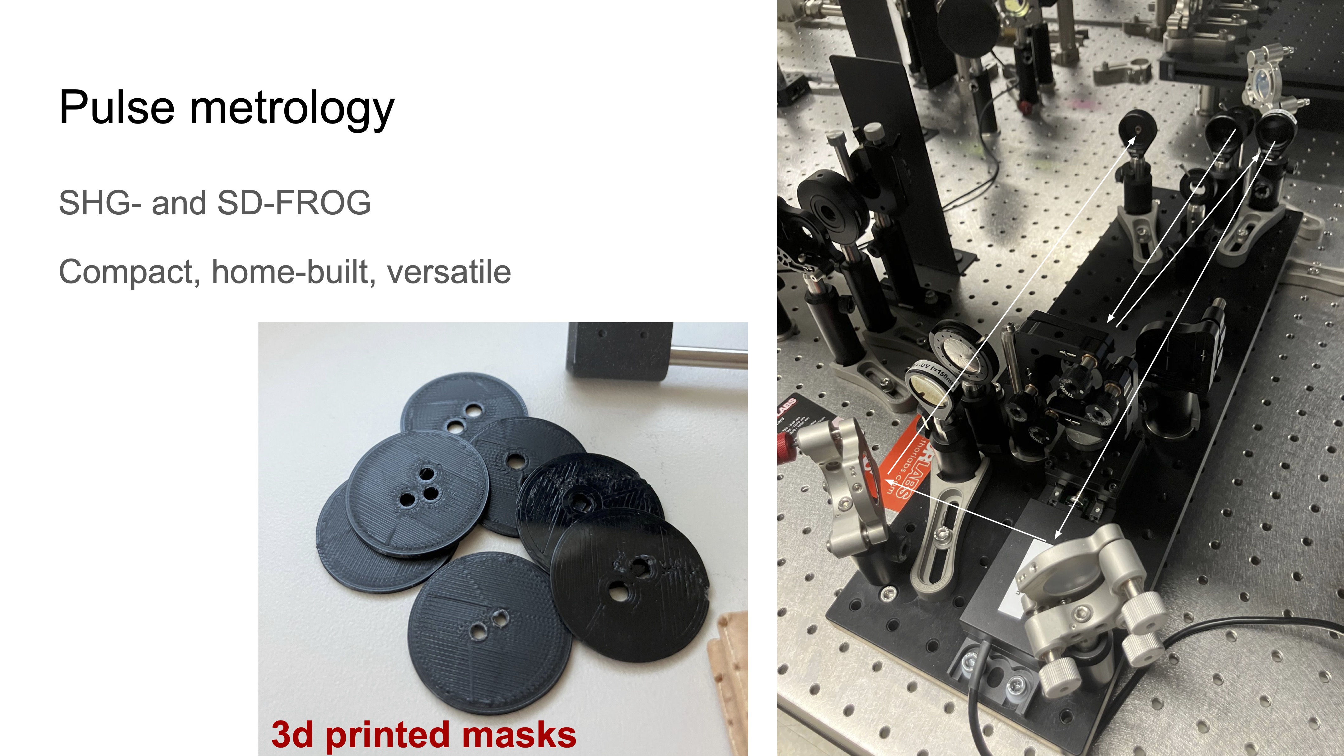 The pulse characterization is performed using a home-built SD-FROG, shown below, in addition to the 3-D printed masks we use to perform the measurement.
