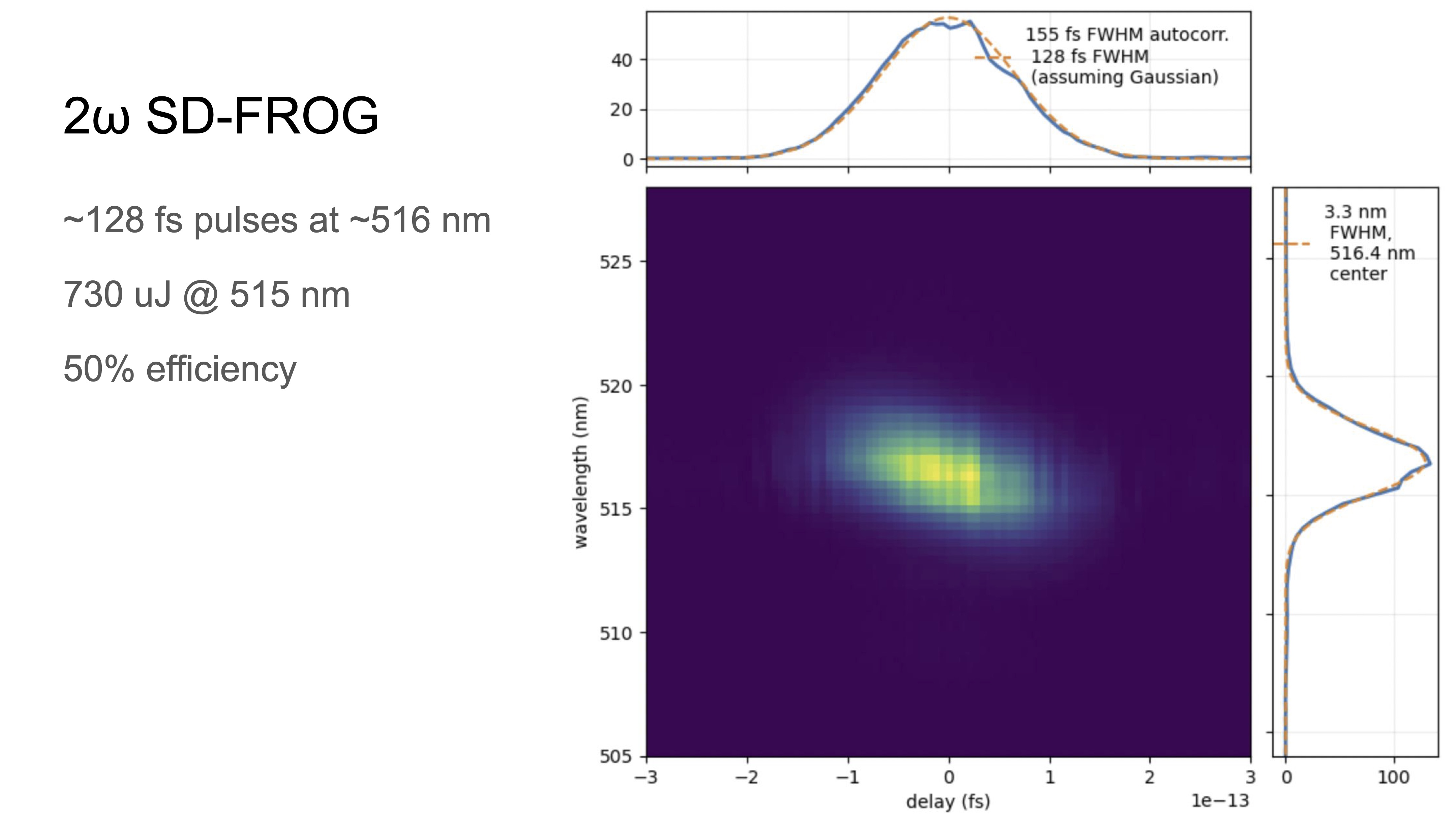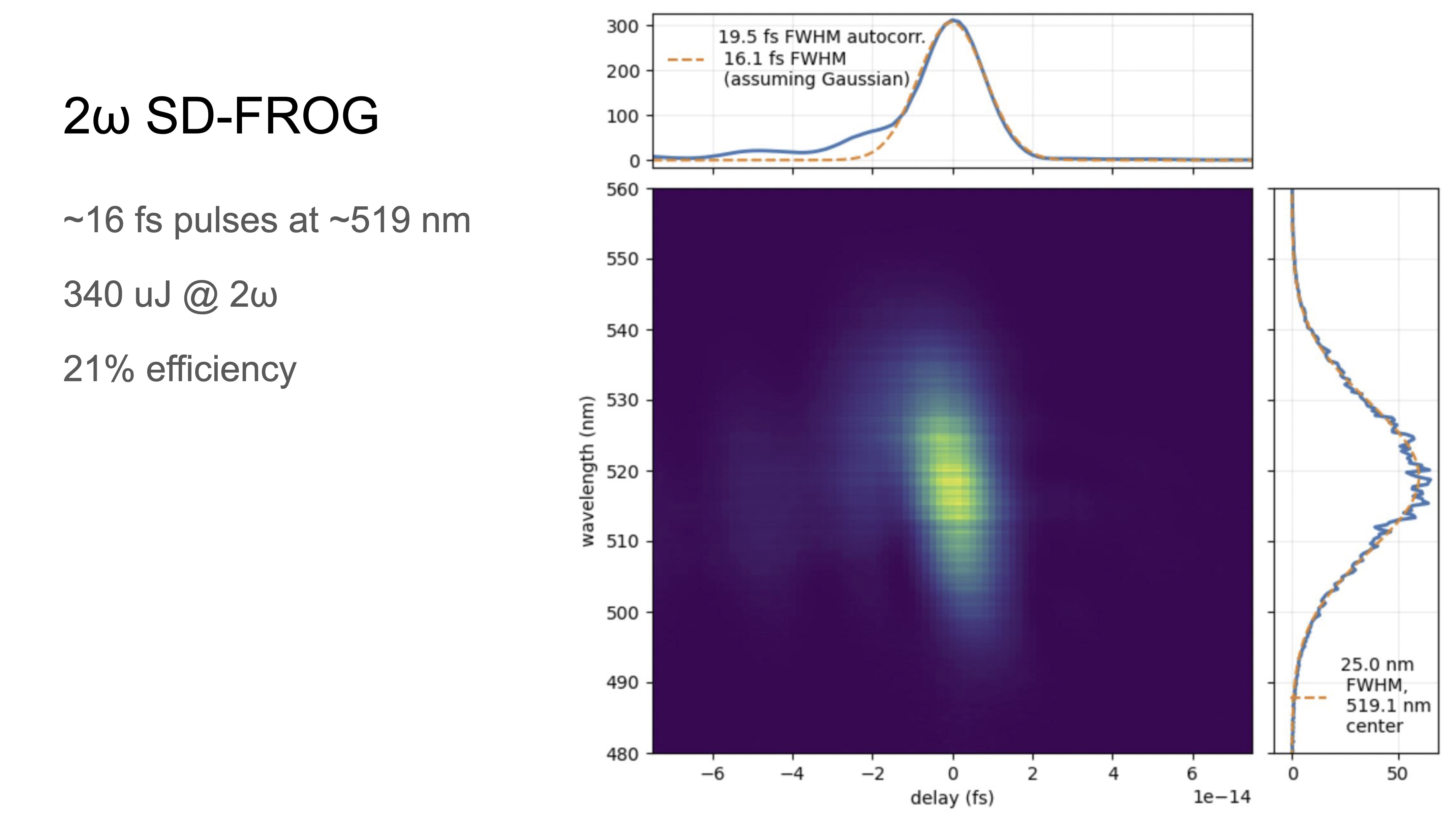 The second harmonic of the native Carbide output (516 nm) is characterized using SD-FROG, which is shown below.