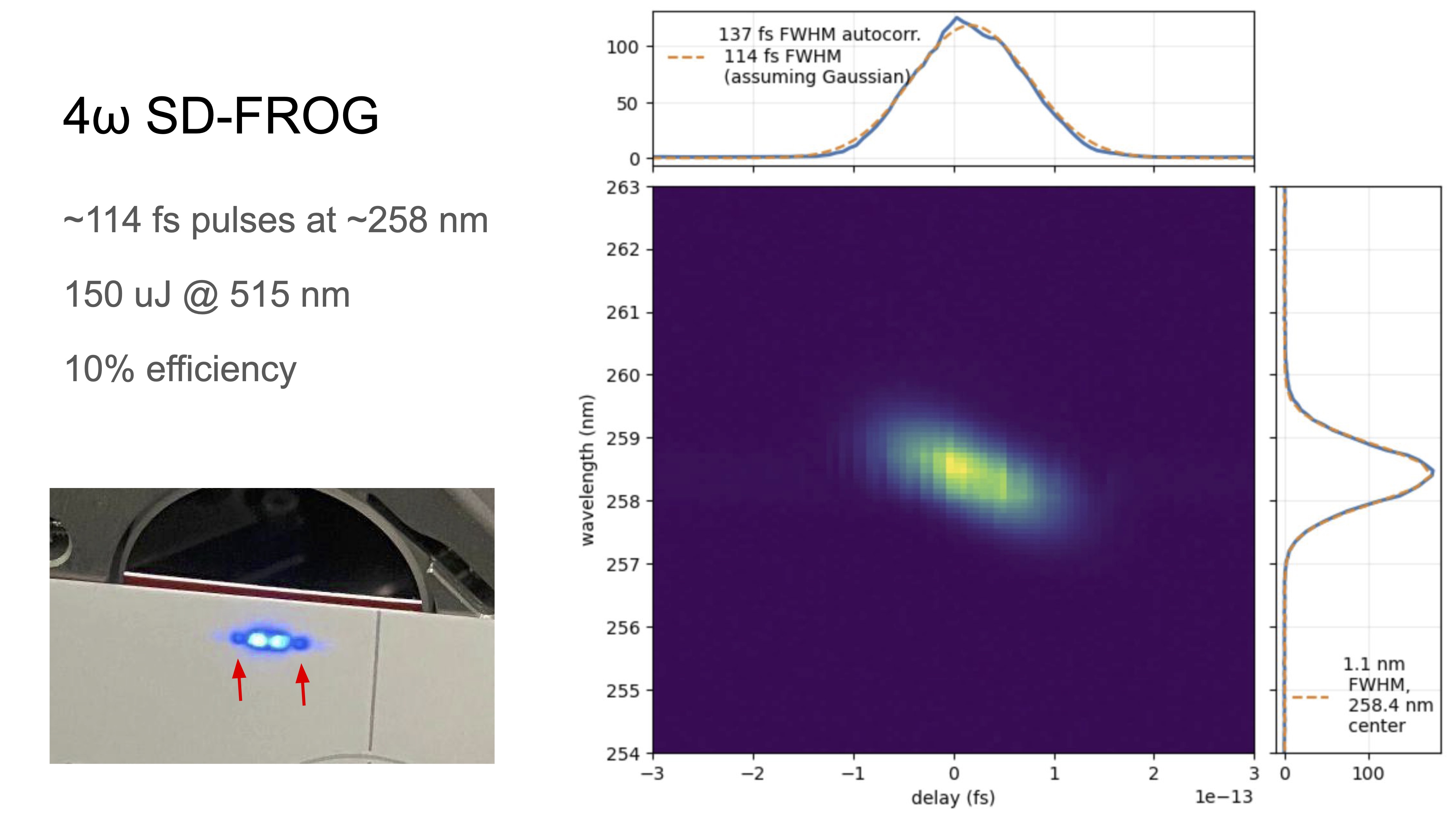The fourth harmonic of the spectrally broadened Carbide output (258 nm) is characterized using SD-FROG, which is shown below.