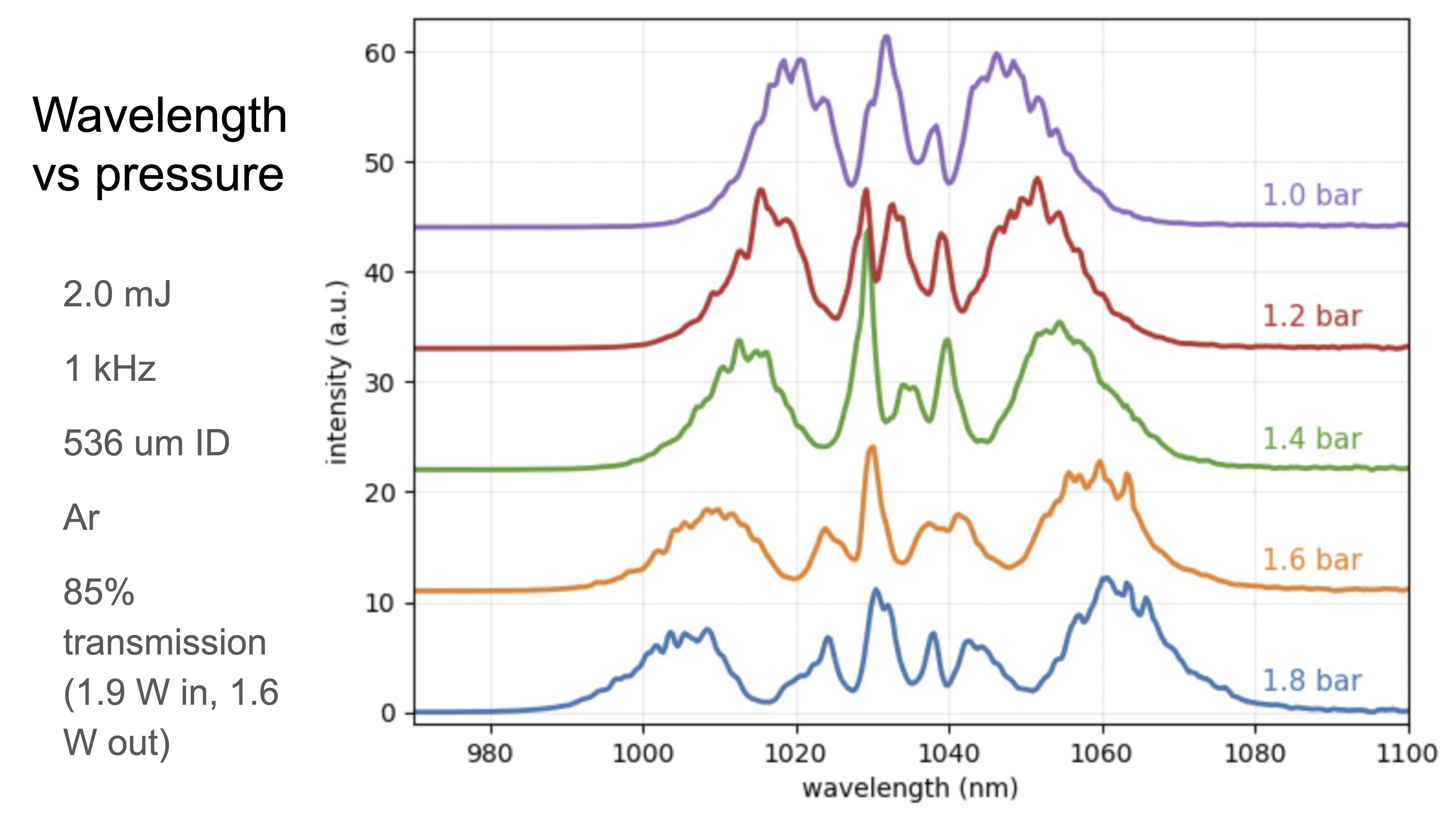 Next, we perform spectral broadening and post-compression of the Carbide, which is then used to generate shorter pulse harmonics in bulk crystal. Below is the spectrally broadened output of the Carbide laser for different hollow capillary fiber gas pressures.