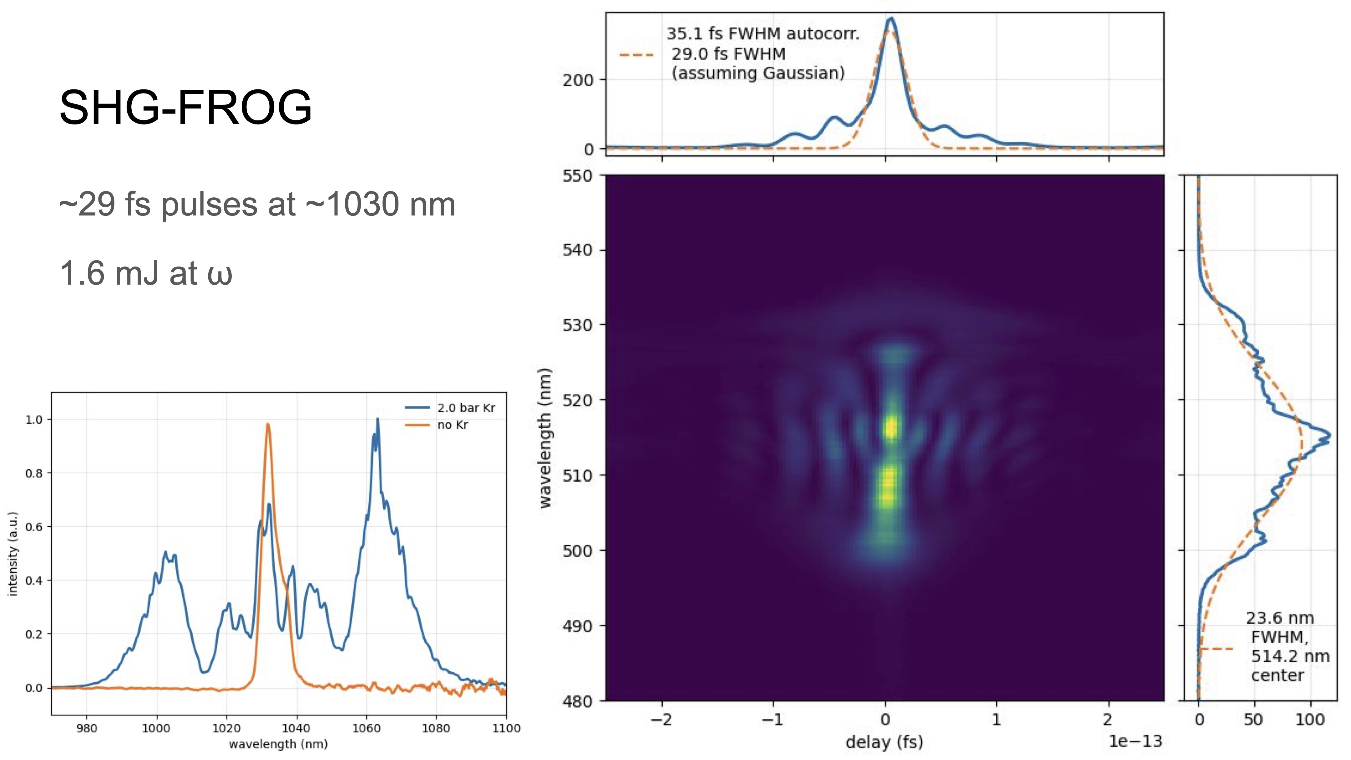 Characterizing harmonics from a spectrally broadened Yb Carbide laser using using self-diffraction frequency-resolved optical gating (SD-FROG).